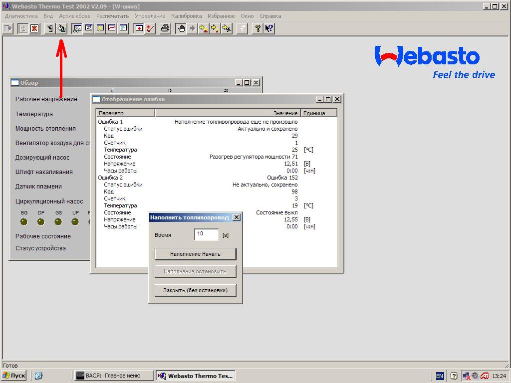 На вопрос можно как то ВагКомом прокачать топливную магистраль? Отвечаю: так же, как и снять ошибку " наполнение контура" или "наполнение топливопровода не произошло". Эта ошибка всегда висит если котёл (мозги) новые. У диагностики Вебасто есть соответствующая кнопка (фото), и сделав эту процедуру один раз больше ошибки не будет. Там же ставится время для прокачки магистрали насосом, если это действительно необходимо.