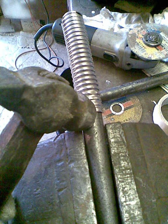 Затягиваем трубу в тиски. И обстукиваем гофру молотком.