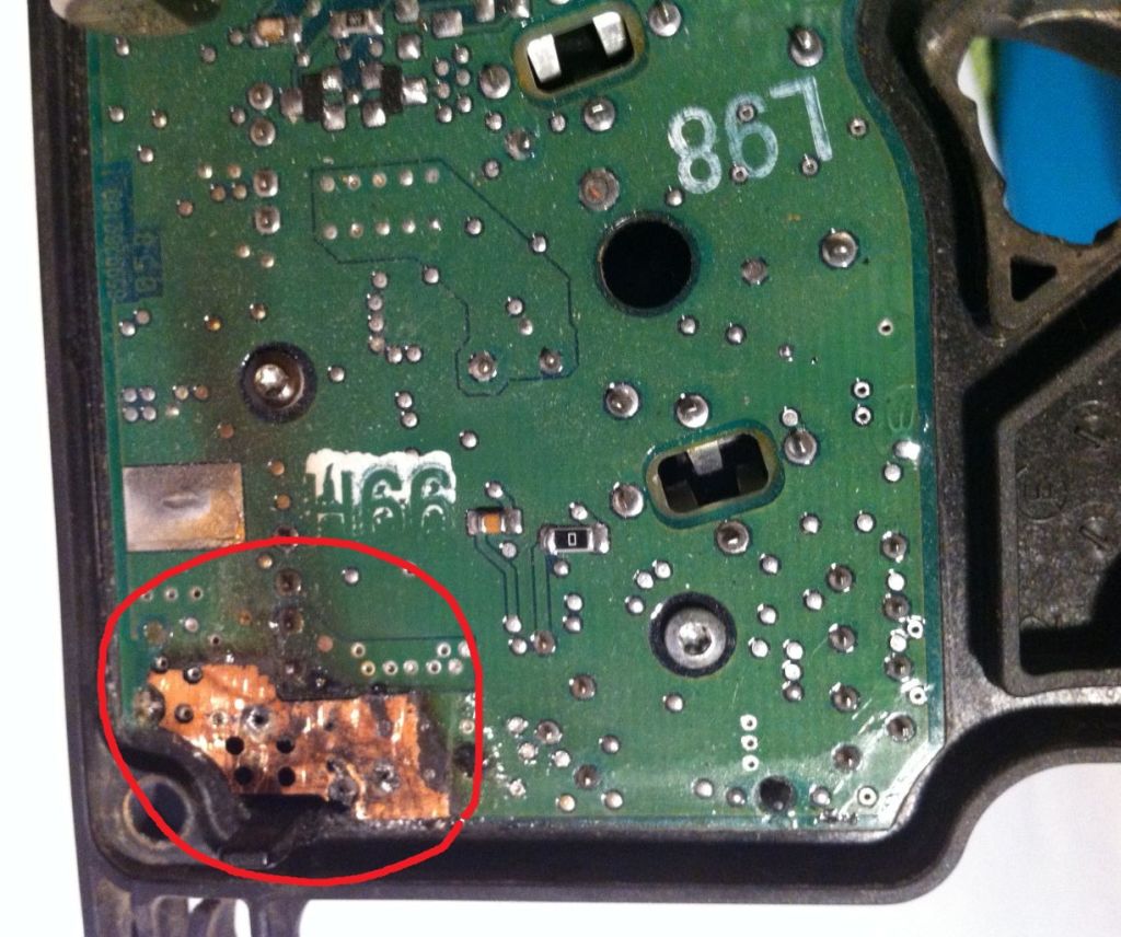 По поводу того, что случилось, прикладываю фото. Проблема обведена красным. То, что сейчас голая медь, когда вынули плату, было всё чёрным. Отчего это случилось - непонятно, может, здесь кто-нибудь прояснит? Две предыдущих зимы, когда машина была у меня, никаких проблем с вебастой не было. До конца зимы отработала на отлично. Случайно обнаружил проблему летом, когда проверял свежекупленный кабель VCDS и наткнулся на ошибку свзяи с блоком управления вебасты. В итоге сначала вышел на то, что моментально перегорает предохранитель вебасты, который под капотом (в том числе и на выключенной машине - ну, это понятно, автономка), а потом вот на эту плату.